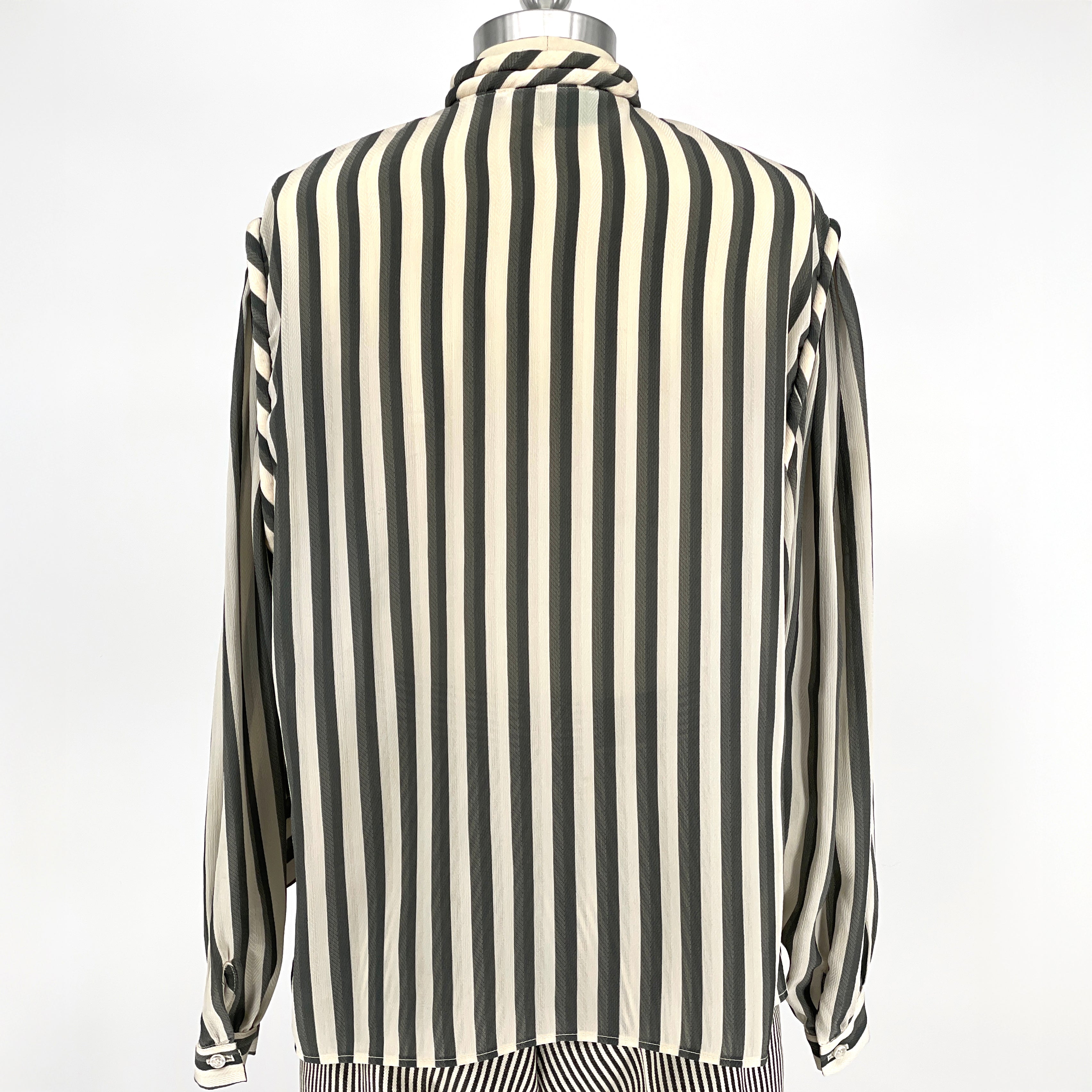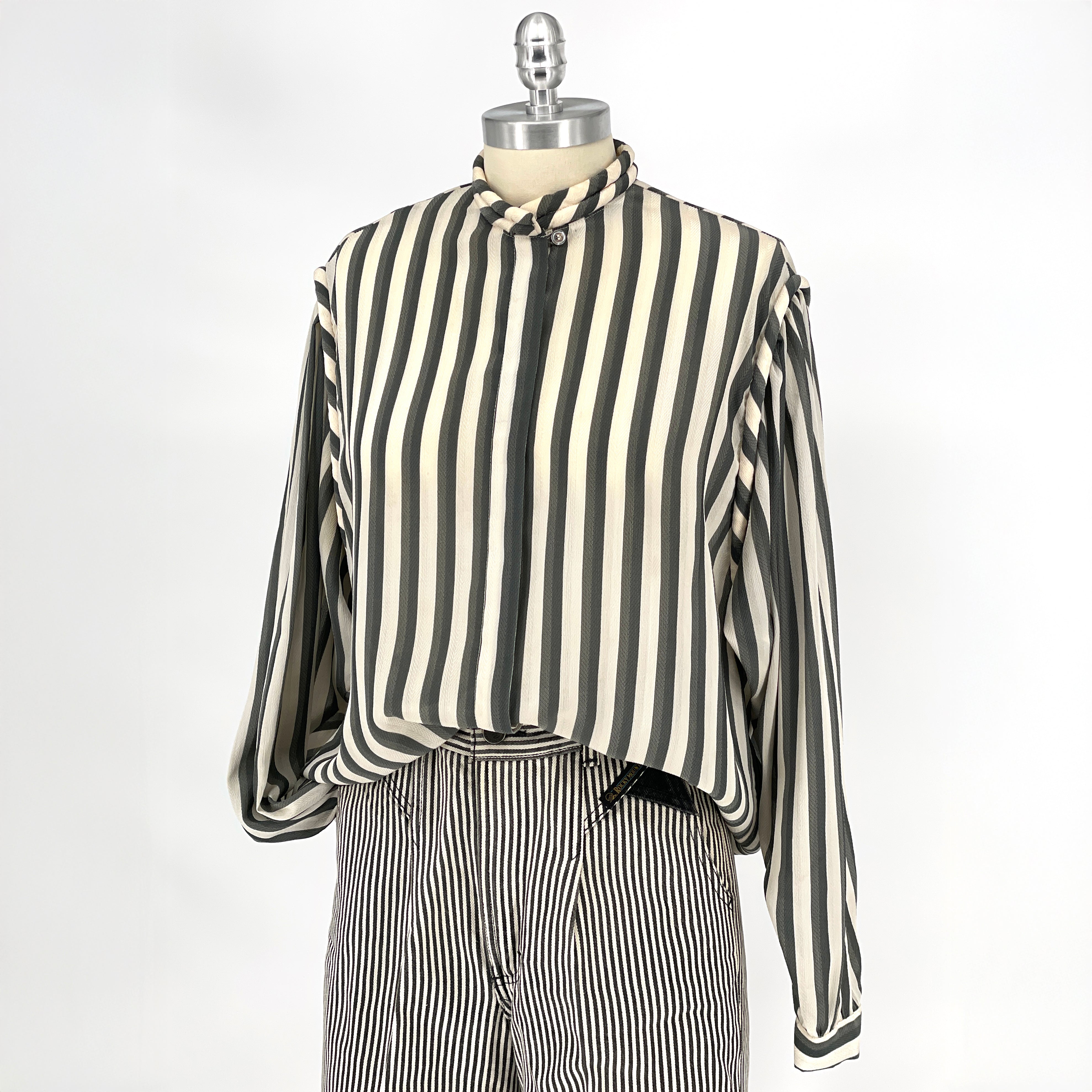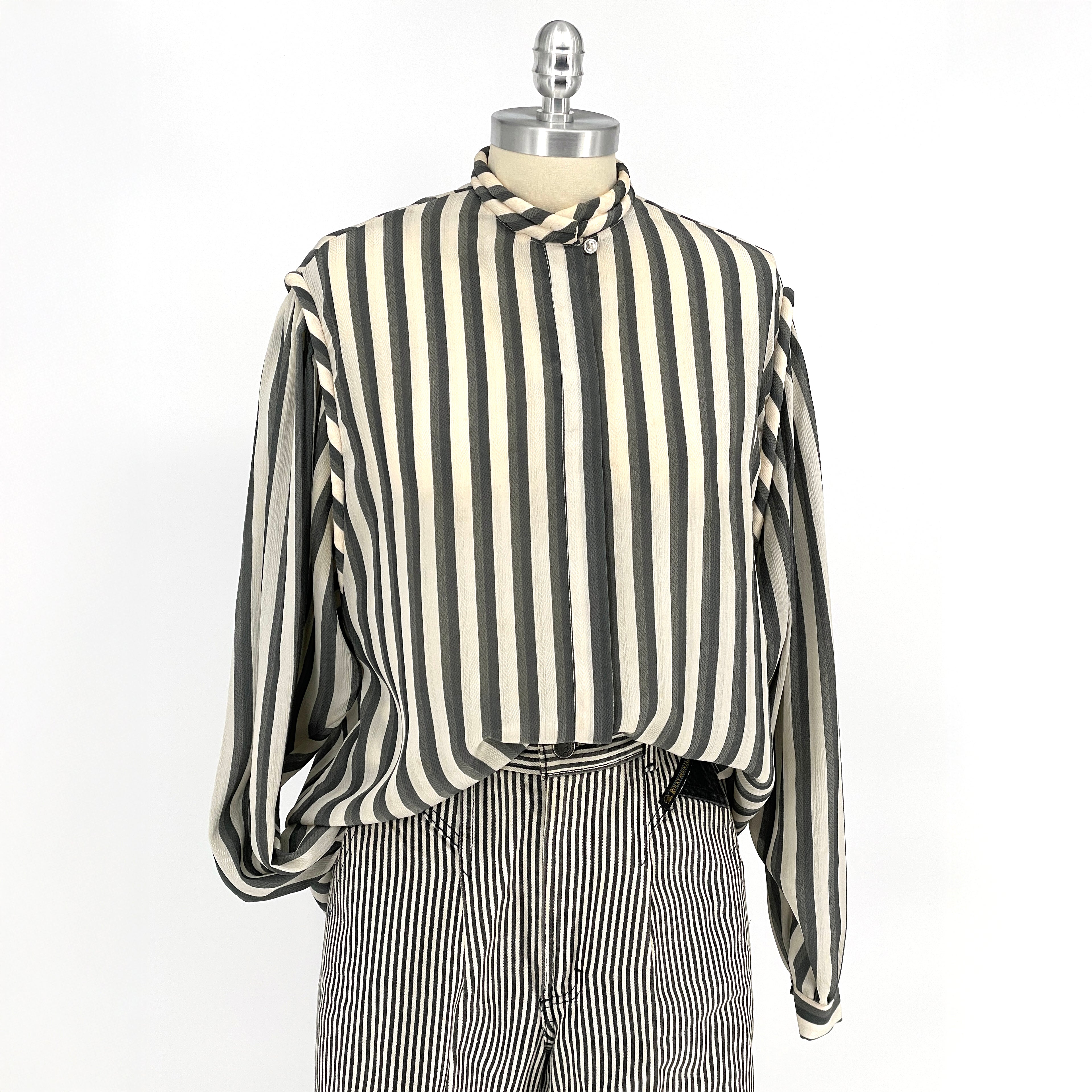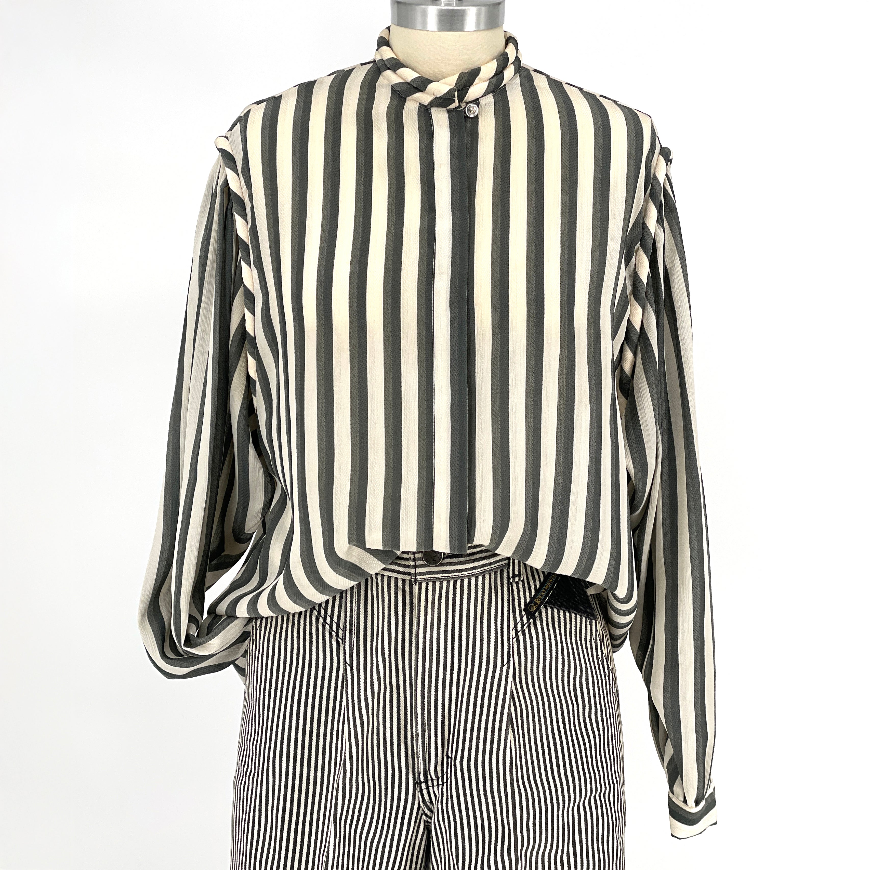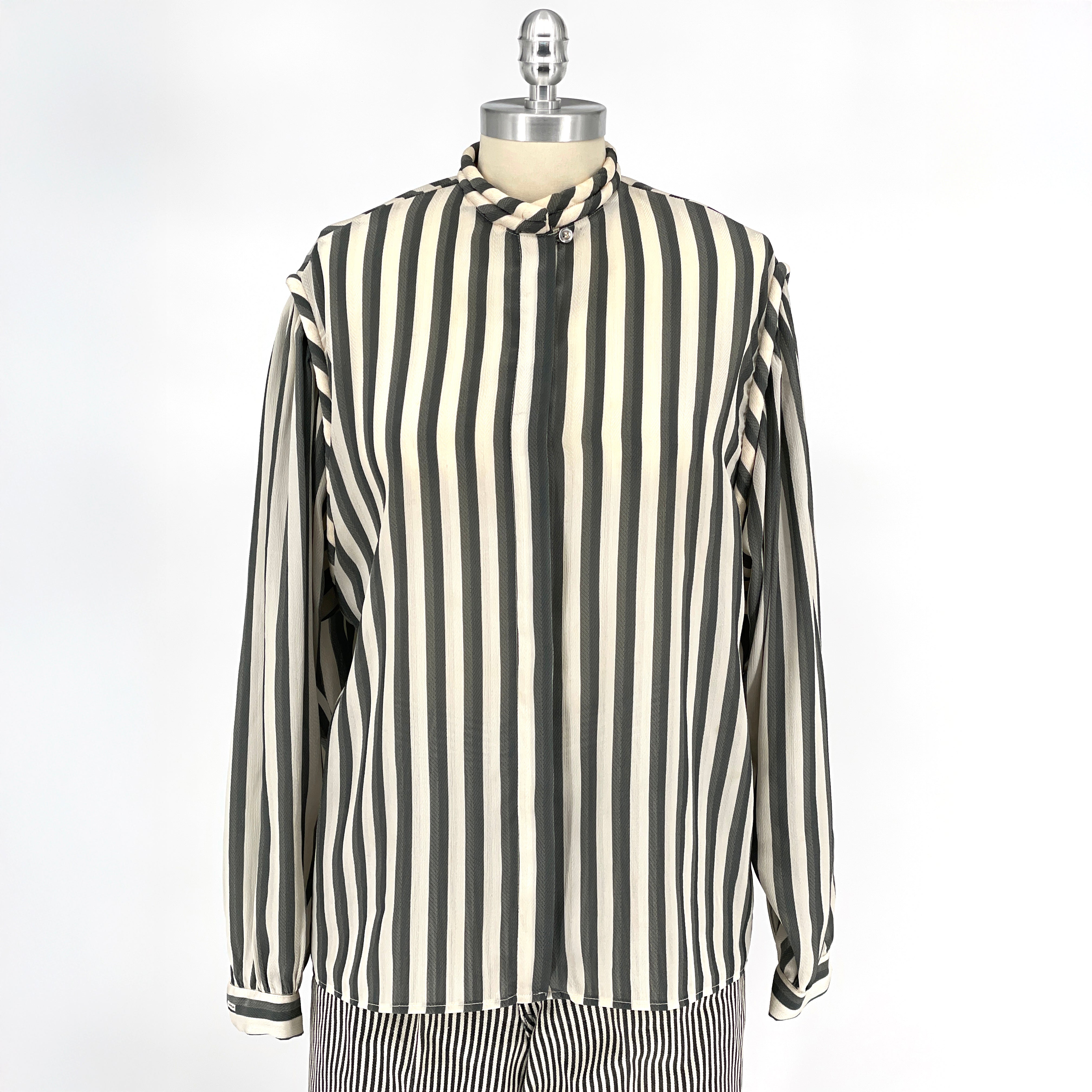 Intellectual minimalism from the early 1990s. A sheer striped blouse defined by subtle texture and thoughtful detailing. The standing rope band collar and rope-trimmed shoulder seams lend quiet distinction, while the softly structured shoulders add shape without excess.