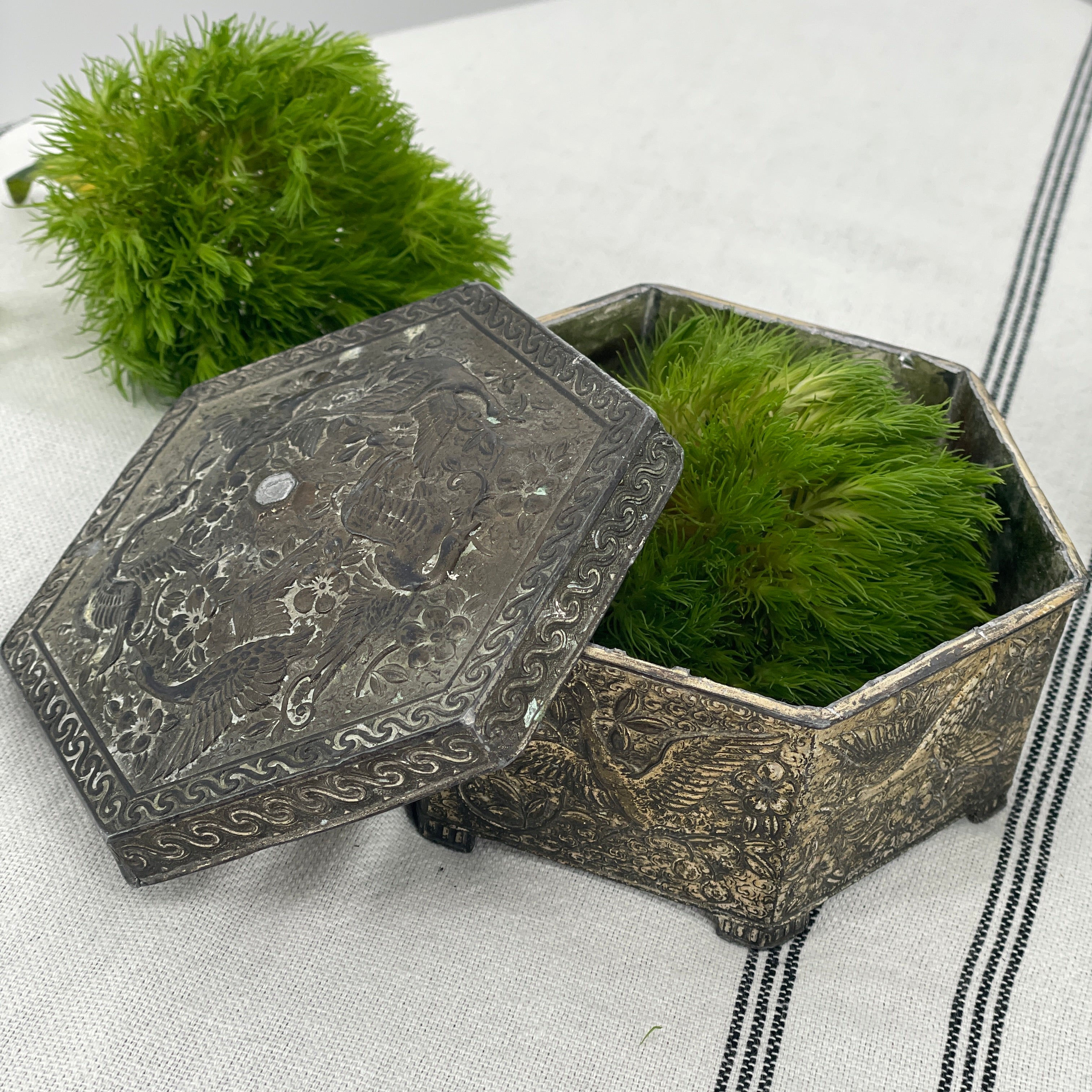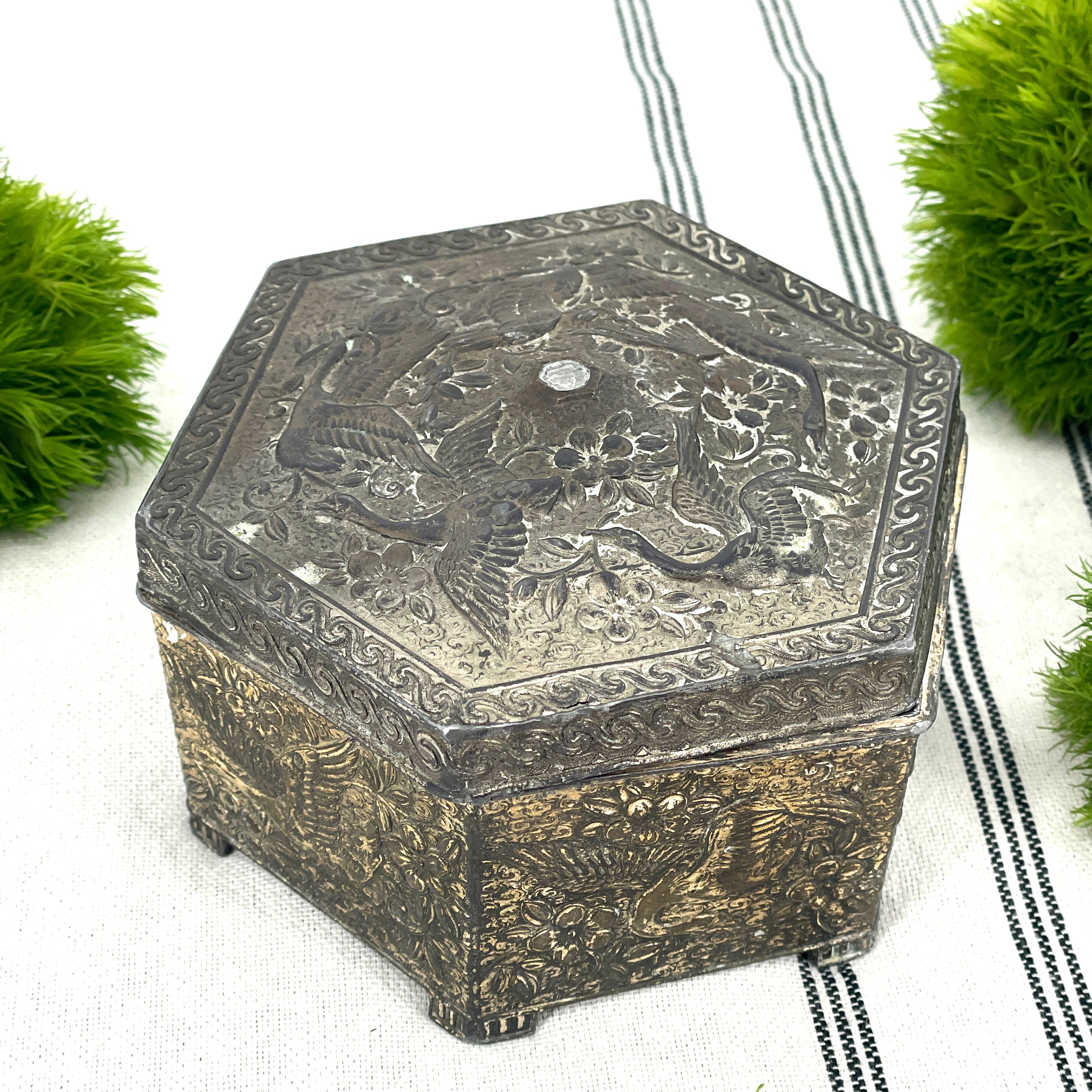 A beautiful piece for jewelry storage, keepsakes, or display. The aged patina adds depth and character, highlighting the detailed relief work. Made in Japan.