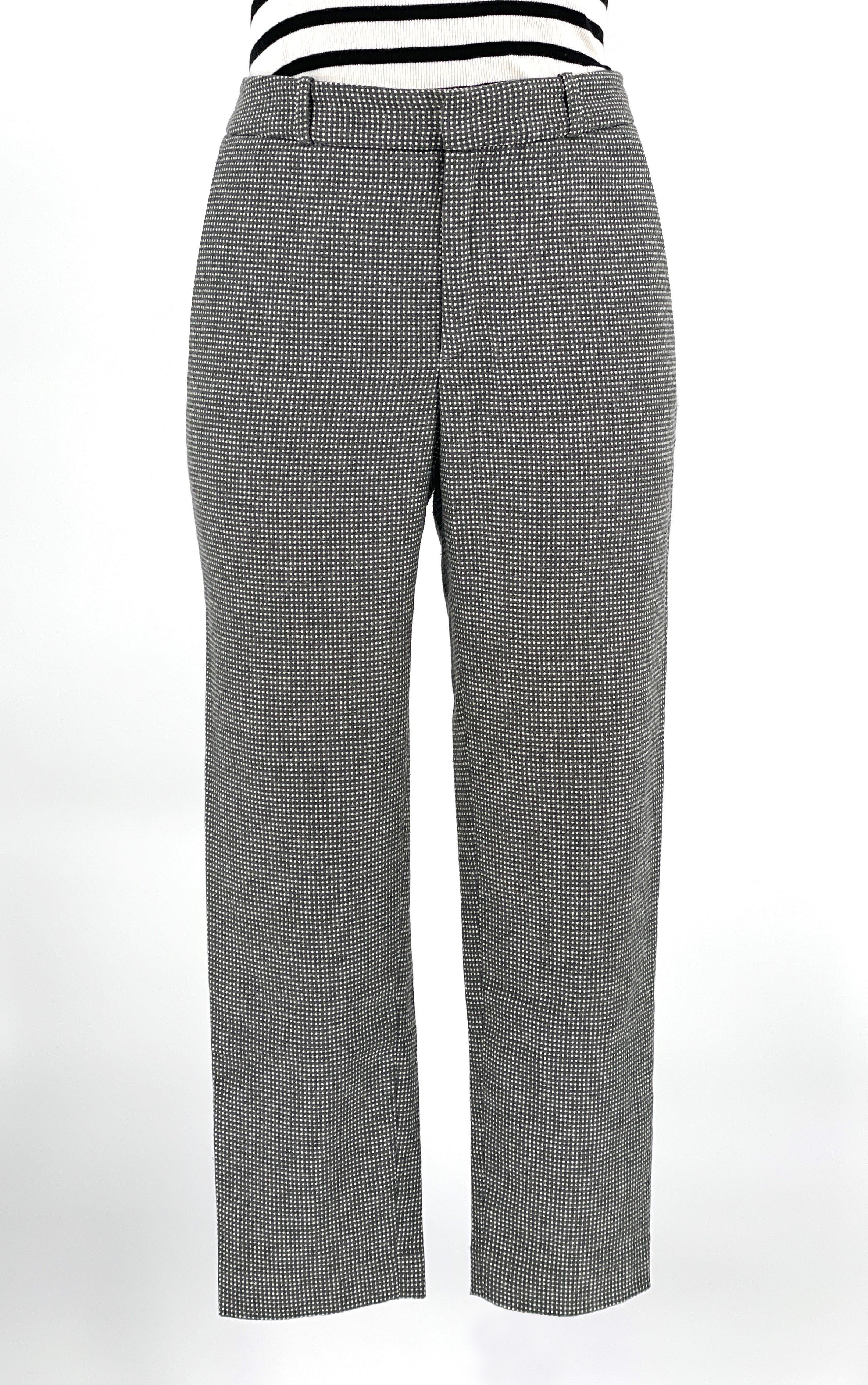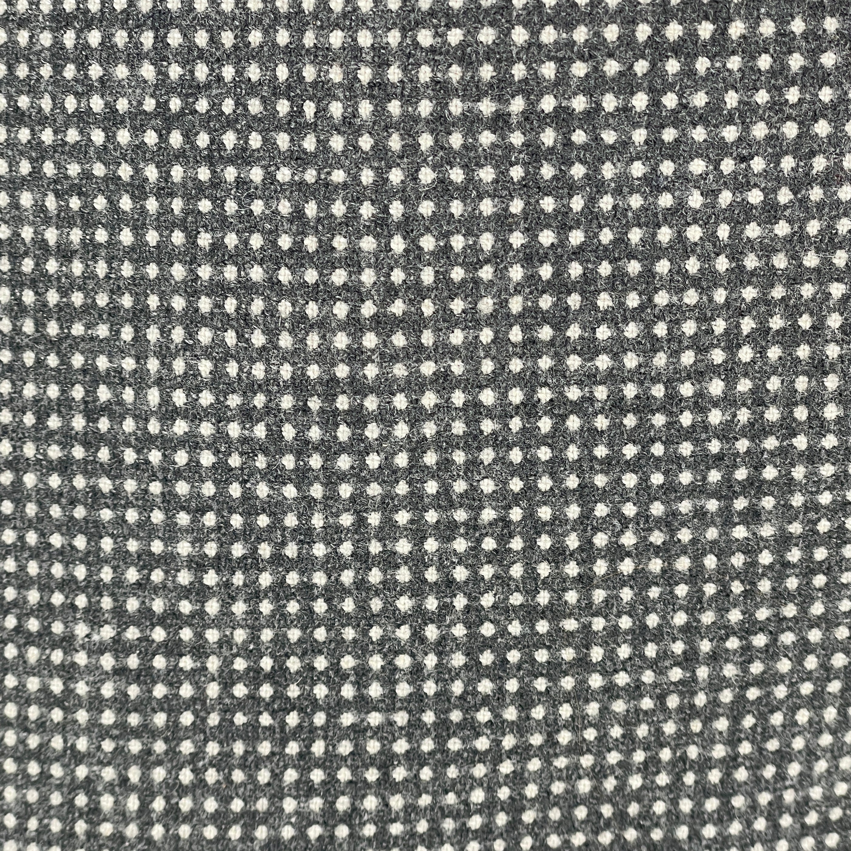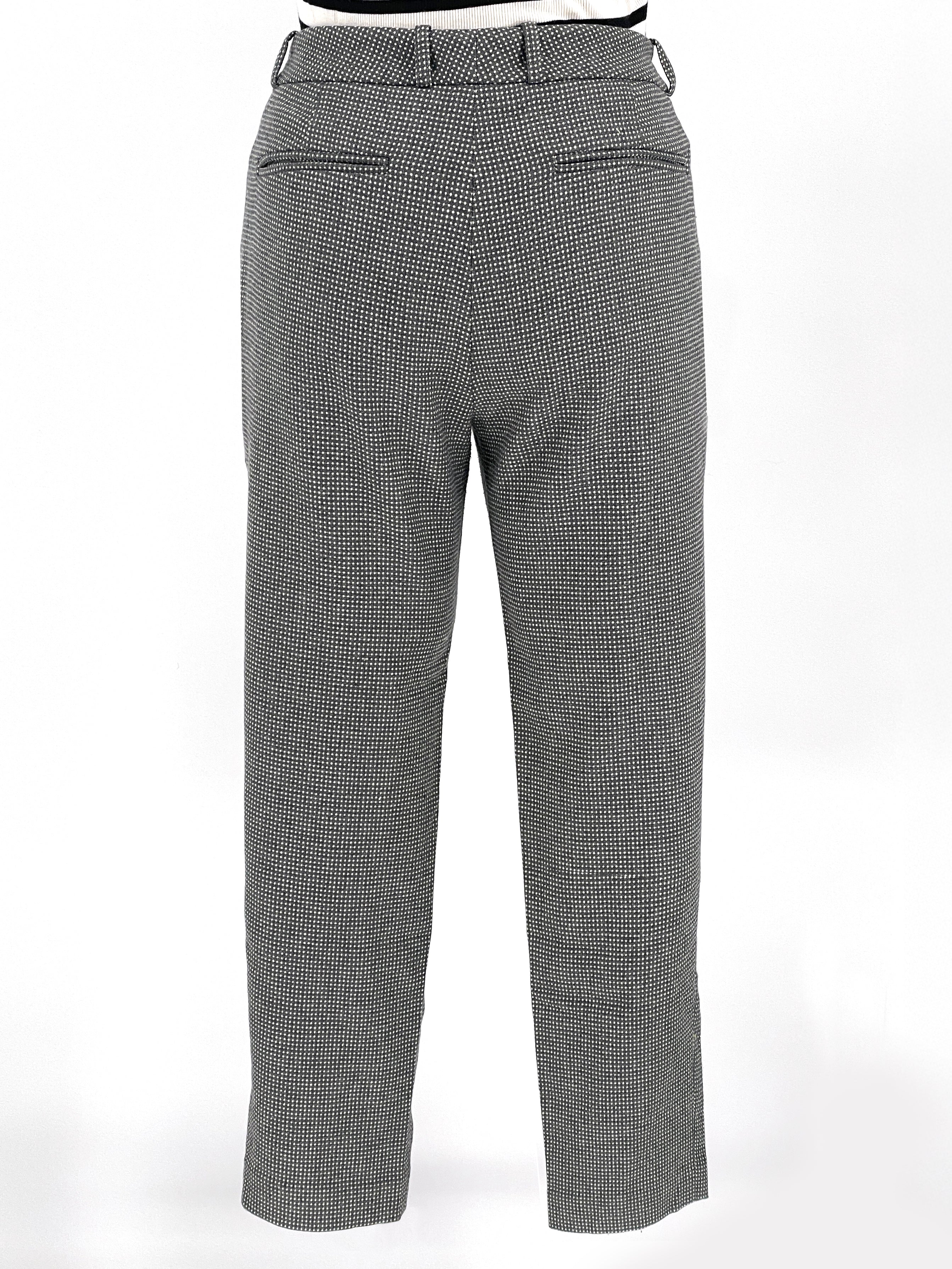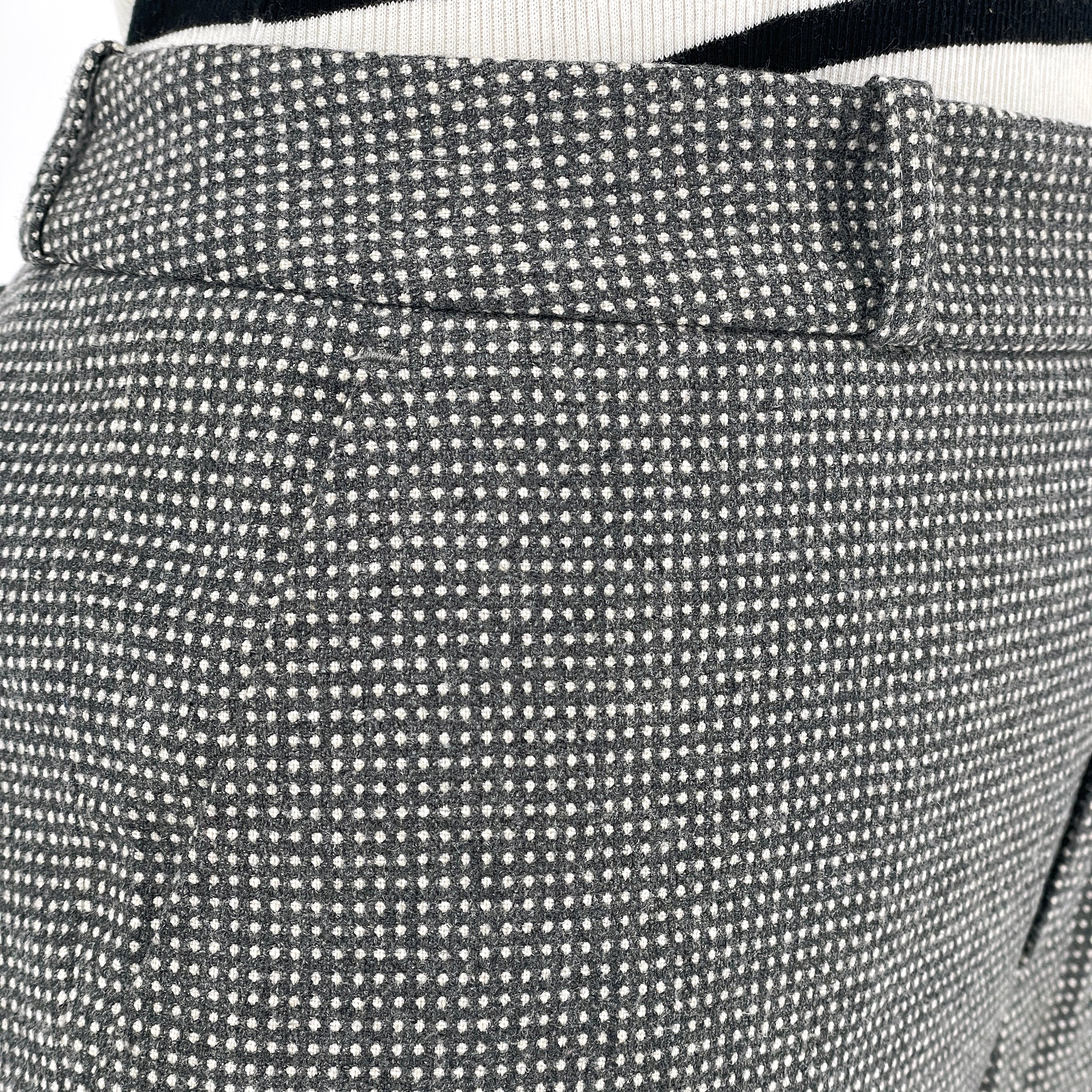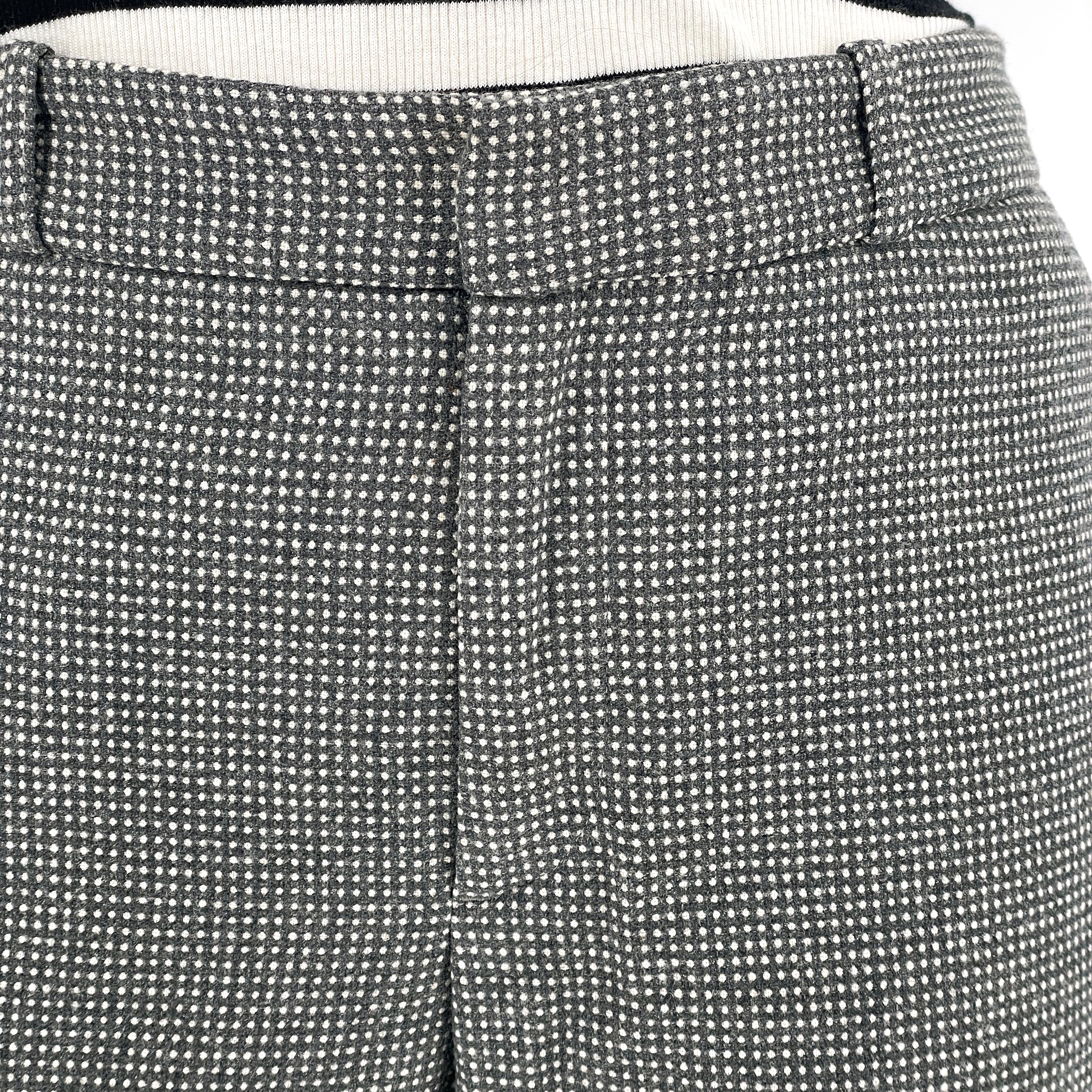 Designed in the early 2000s by Steven Alan — a label known for restrained tailoring and thoughtful fabrication — these trousers sit firmly in the era of intelligent minimalism.At first glance they read solid charcoal. On closer inspection, a dense micro-dot weave reveals itself — a subtle grid of white against grey wool, creating depth without overt pattern. Texture instead of print.