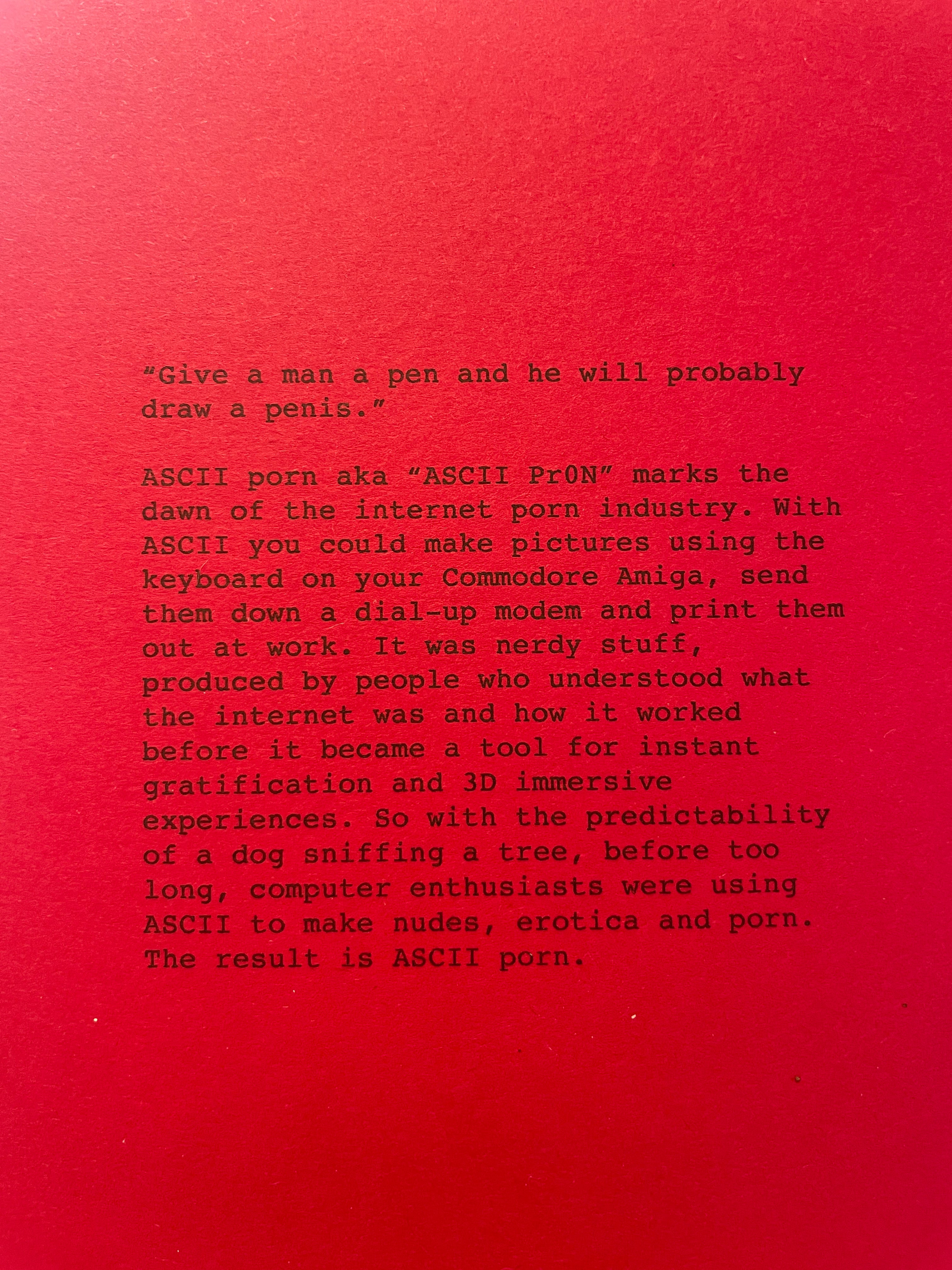 40-page zine about the wild, wonderful world of ASCII porn art! NSFW! Although, technically all it is is a configuration of punctuation symbols, spaces and letters so maybe you can show it to your boss?