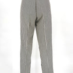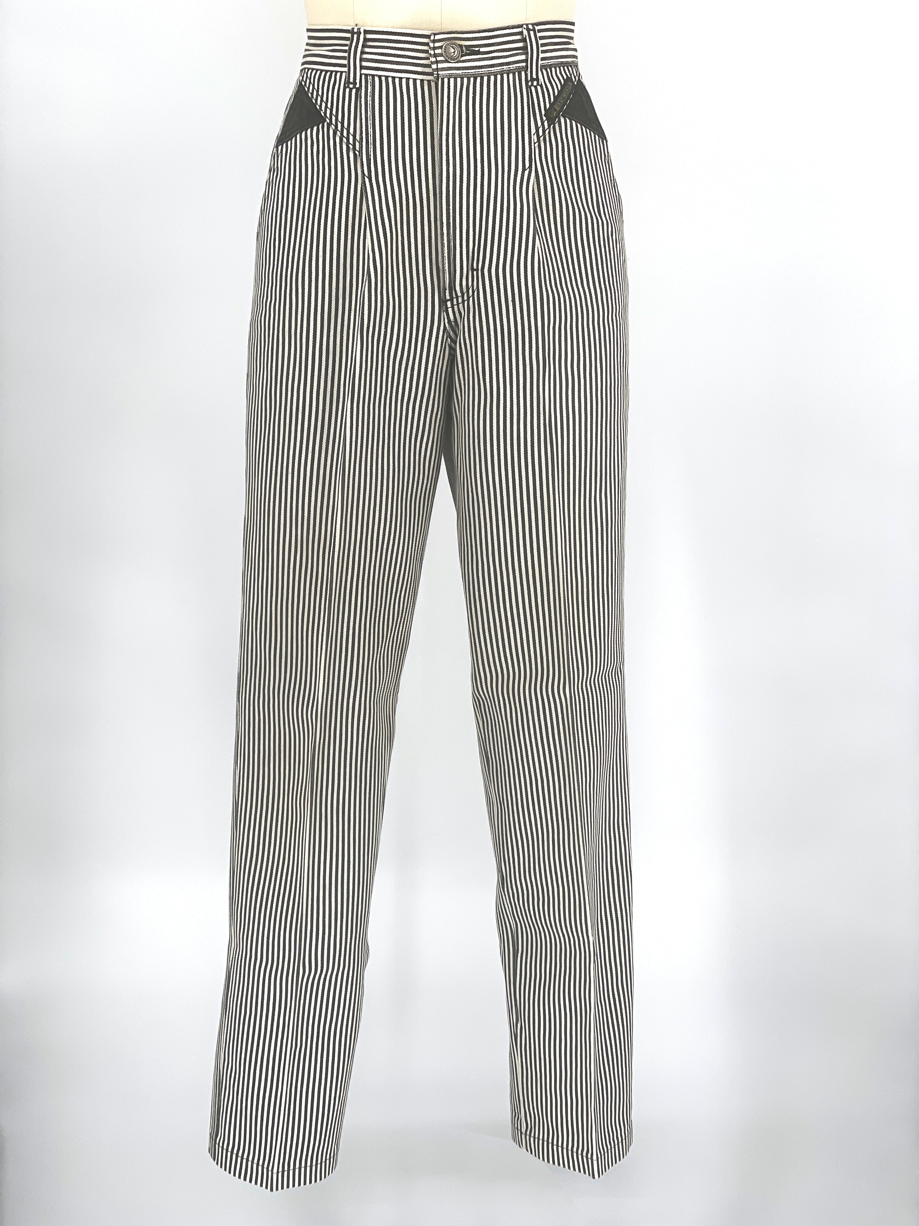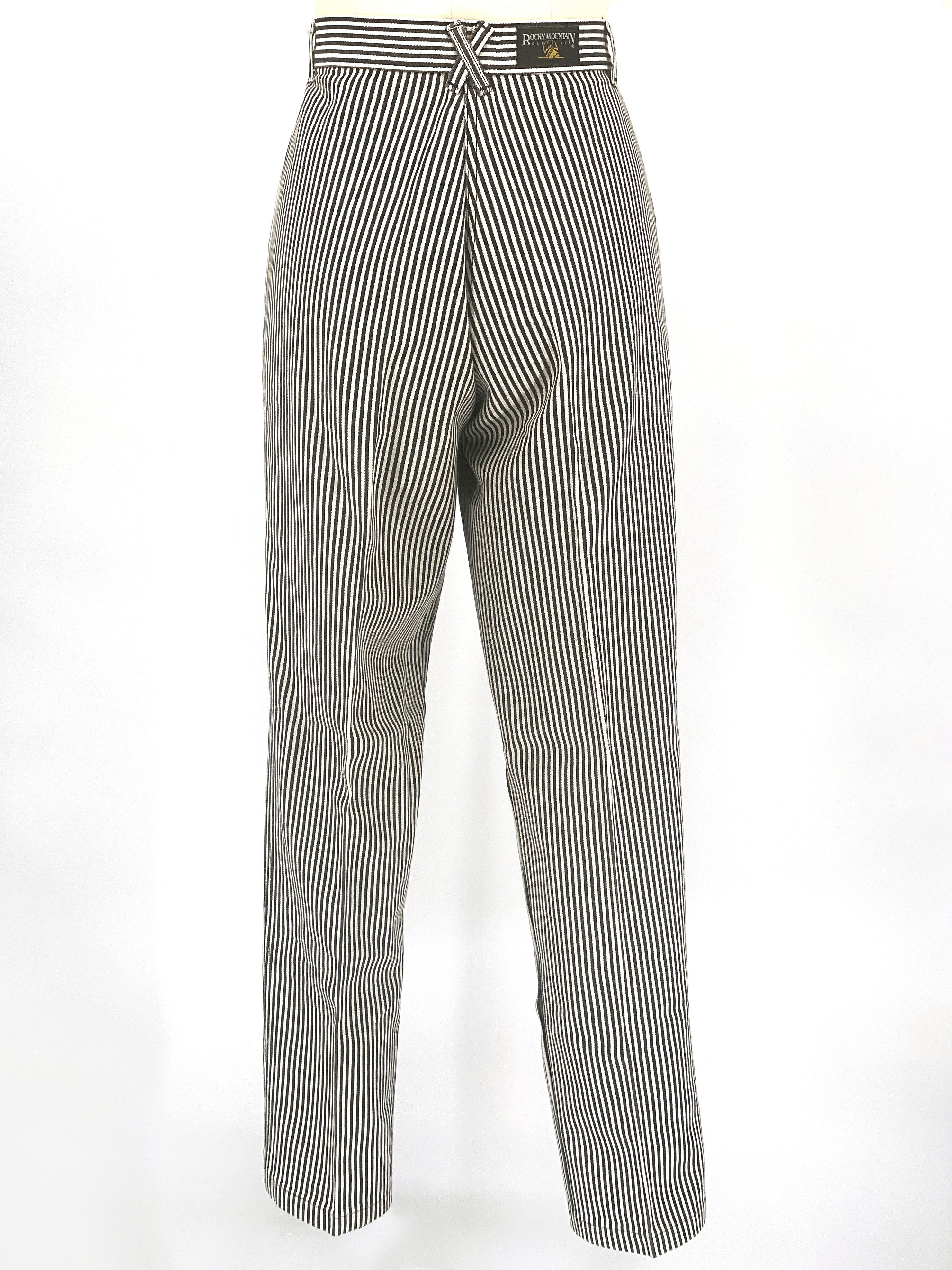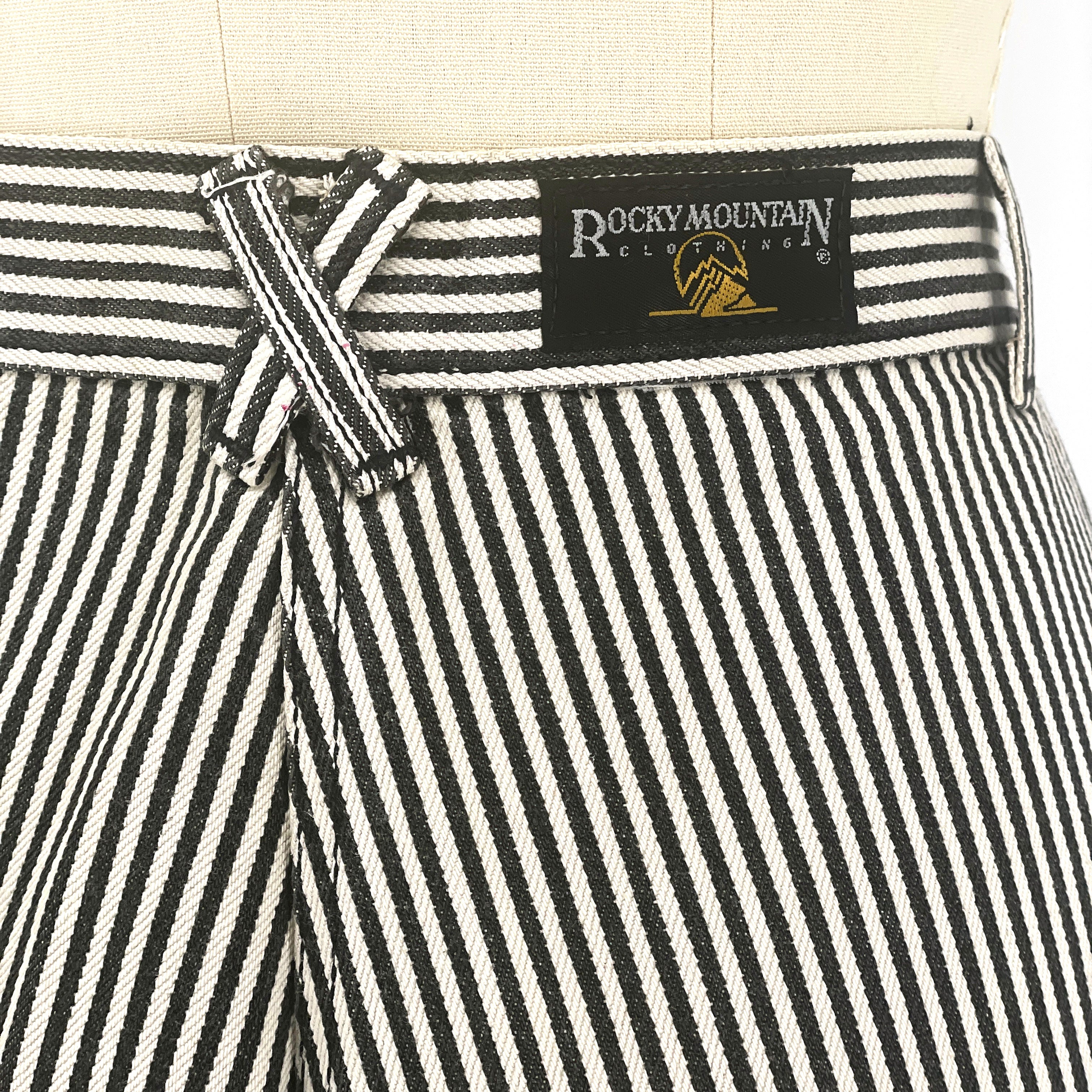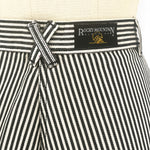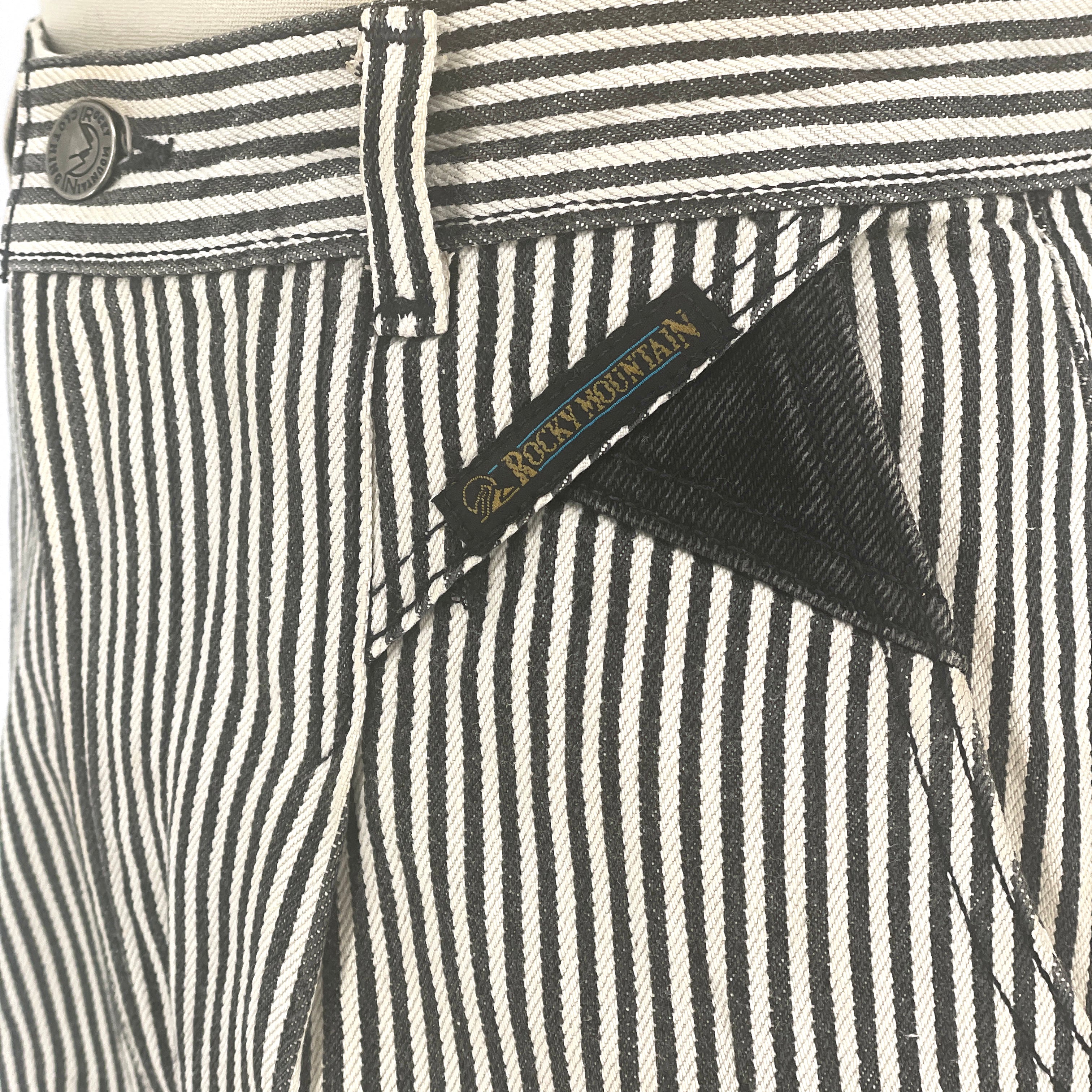 Black and white vertical stripe cotton twill creates a strong graphic line. The construction is deliberate: angled pocket panels, contrast black inset details, and a directional stripe waistband that shifts horizontally for emphasis. The back X detail at the waistband reinforces the Western lineage without excess ornament.